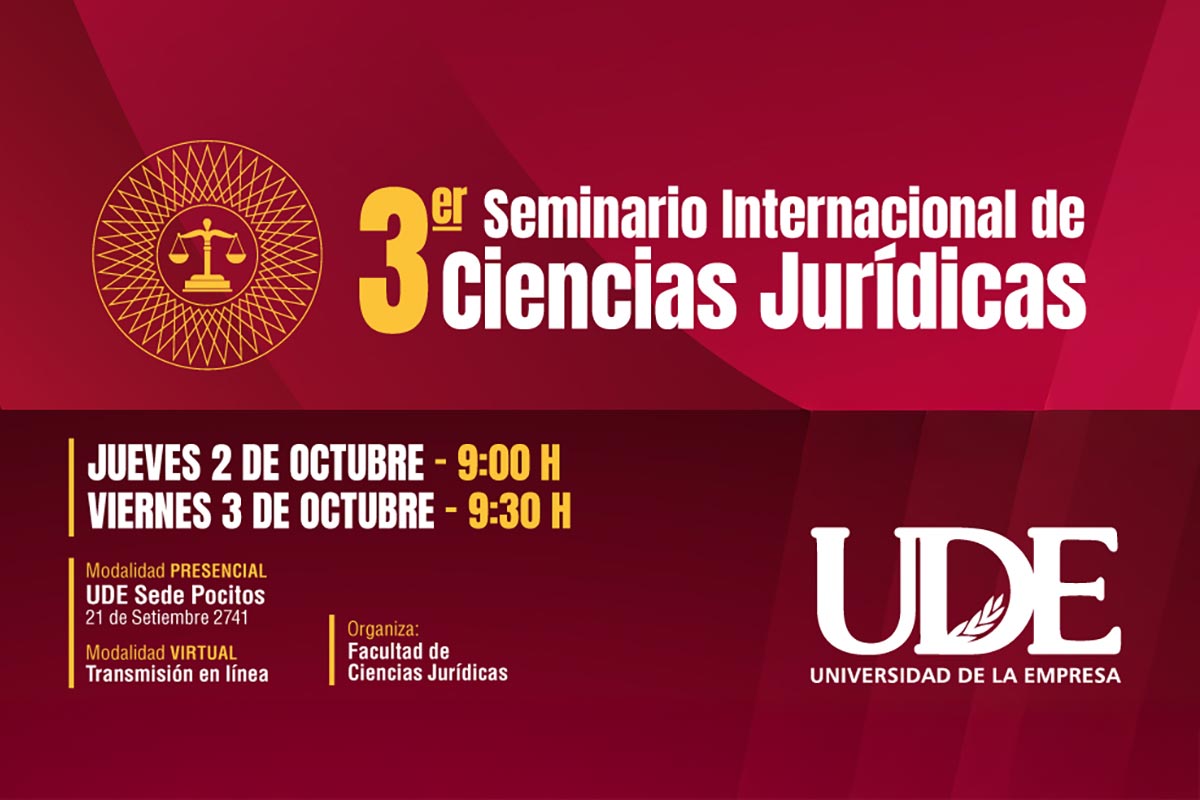 La Facultad de Ciencias Jurídicas de la UDE reunirá en Montevideo a juristas, académicos y referentes de gestión pública de Uruguay y Brasil en la tercera edición del Seminario Internacional de Ciencias Jurídicas, que se realizará el jueves 2 y viernes 3 de octubre de 2025 en UDE Sede Pocitos (21 de Setiembre 2741), con transmisión en línea. La actividad es sin costo, con inscripción previa.