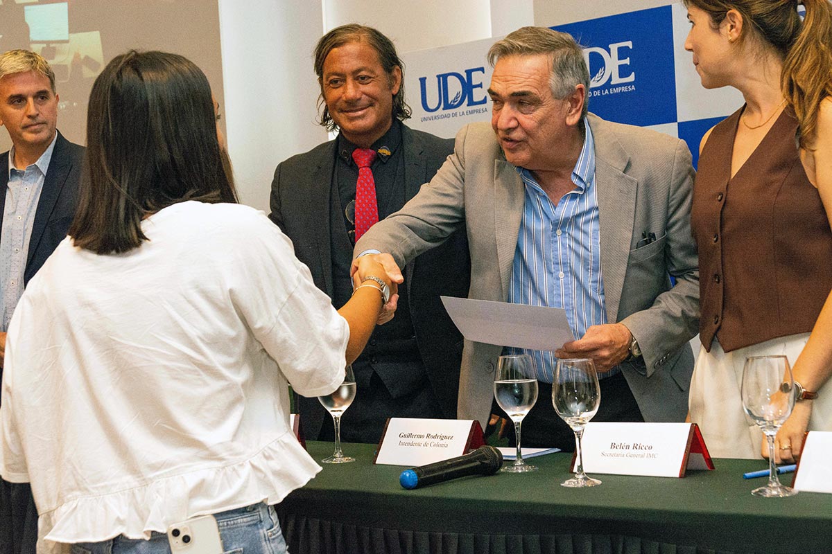 Las imágenes del evento ayudan a leer bien el momento. Hubo sala colmada, aplausos sostenidos, presencia de estudiantes, autoridades universitarias y referentes públicos. También quedó retratada la centralidad del intendente Rodríguez en la jornada: aparece en la mesa principal, en la entrega de becas y en el intercambio directo con los estudiantes, subrayando que la relación entre la Intendencia y UDE no pasa solo por un convenio firmado, sino por una política visible de respaldo institucional a la formación superior en Colonia.